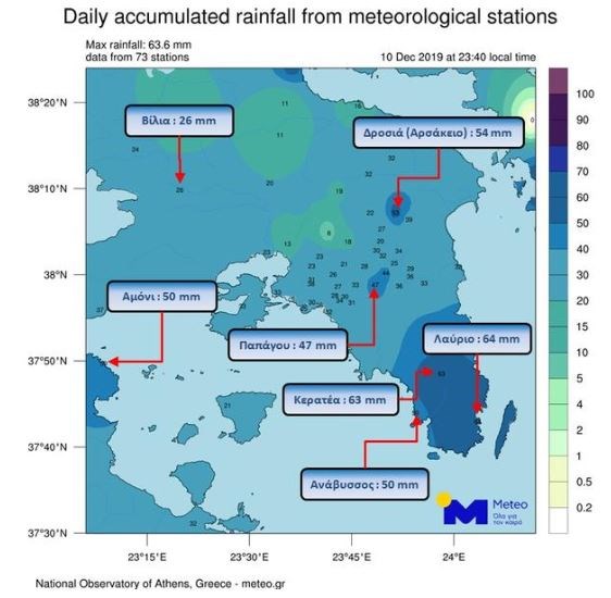 Στο σύνολο της ημέρας σημειώθηκαν σημαντικά ύψη βροχόπτωσης, όπως διακρίνεται στον παρακάτω χάρτη, σύμφωνα με τις καταγραφές 73 μετεωρολογικών σταθμών του Μετεωρολογικού και Κλιματικού Παρατηρητηρίου Αττικής του Εθνικού Αστεροσκοπείου Αθηνών / meteo.gr.