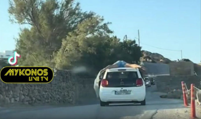 Όπως φαίνεται σε βίντεο του mykonoslive.tv, ένας νέος έχει ξαπλώσει μπρούμυτα στην οροφή ενός μικρού αυτοκινήτου το οποίο βρίσκεται εν κινήσει σε δρόμο του νησιού, ενώ ένας φίλος του έχει ανοίξει την πίσω πόρτα του οχήματος και τον τραβάει βίντεο για να το ανεβάσει στα μέσα κοινωνικής δικτύωσης και να κάνουν την πλάκα τους.