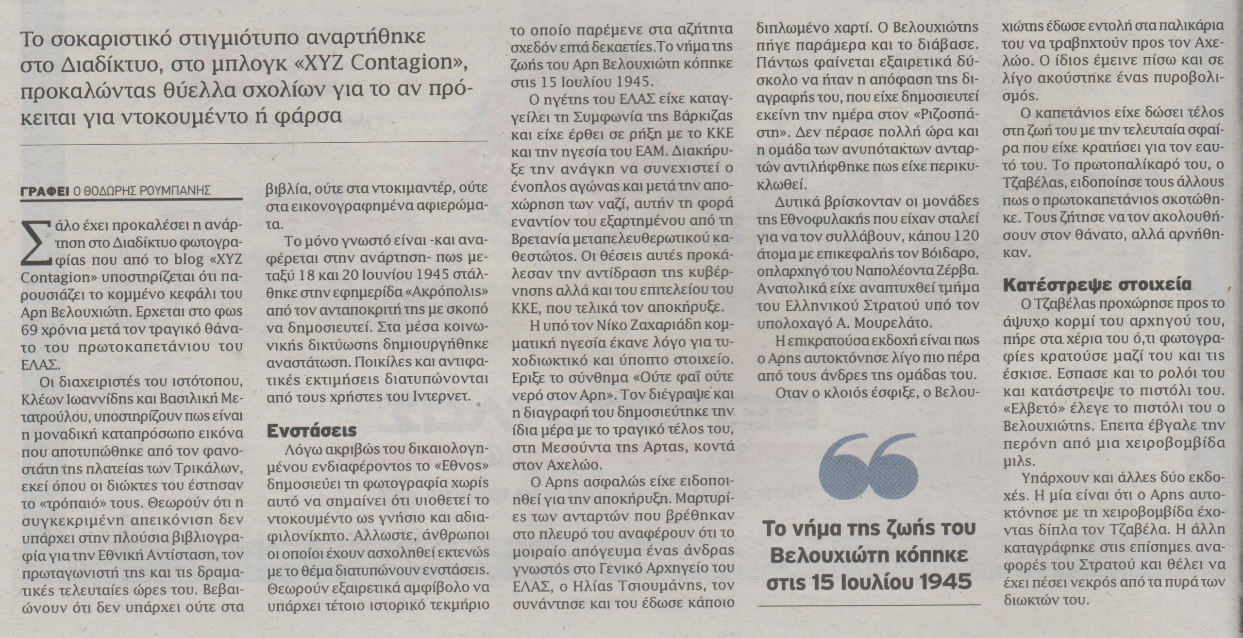 Σάλο έχει προκαλέσει η ανάρτηση στο διαδίκτυο φωτογραφίας που από το blog «XYZ Contagion» υποστηρίζεται ότι παρουσιάζει το κομμένο κεφάλι του Άρη Βελουχιώτη. Έρχεται στο φως 69 χρόνια μετά τον τραγικό θάνατο του πρωτοκαπετάνιου του ΕΛΑΣ.