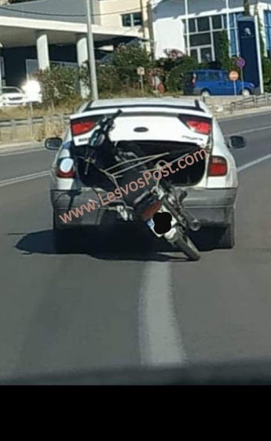 Αποφάσισε να μεταφέρει ένα μηχανάκι φορτωμένο στο πορτ-μπαγκάζ. Οι εικόνες είναι από το τη Μυτιλήνη όπου ένας ασυνείδητος οδηγός κυκλοφορούσε σε δρόμο του νησιού το απόγευμα της Κυριακής με το μισό μηχανάκι να είναι μέσα στο πορτ-μπαγκάζ, και συγκεκριμένα η μπροστινή ρόδα και το υπόλοιπο να βρίσκεται στο οδόστρωμα, σέρνοντας το σε όλη την διάρκεια της διαδρομής του.