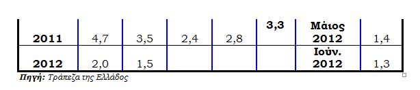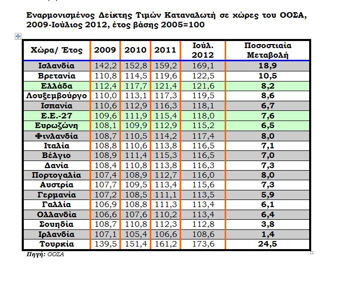 Τα στατιστικά στοιχεία καταδεικνύουν αυτή ακριβώς την αντίθεση. Η κατανάλωση μειώθηκε κατά 14,87% (από 36,9 δισ. ευρώ το β΄ τρίμηνο του 2010 σε 31,45 δισ. το ίδιο τρίμηνο του 2012 σε σταθερές τιμές) αλλά ο πληθωρισμός παρέμεινε υψηλά. Αναλυτικότερα, ο πληθωρισμός στην Ελλάδα και παρά την ύφεση εκτινάχθηκε τα τελευταία δυόμισι χρόνια (2009-Ιούλ. 2012) κατά 8,2 % ενώ στις άλλες δοκιμαζόμενες από την ύφεση χώρα (Πορτογαλία, Ιρλανδία, Ισπανία και Ιταλία) οι αυξήσεις στις τιμές για την ίδια περίοδο διαμορφώθηκαν αντίστοιχα σε 8,0%, 1,4%, 6,7% και 7,1%. Στην Ε.Ε. -27 και στην Ευρωζώνη η άνοδος των τιμών ήταν επίσης χαμηλότερη από ότι στην ελληνική αγορά αφού διαμορφώθηκε σε 7,6% και 6,5% αντίστοιχα.Οι επίμονα υψηλές τιμές σε συνδυασμό με τη μείωση του διαθέσιμου εισοδήματος ανάγκασαν τους καταναλωτές αφενός να μειώσουν τον αριθμό και την αξία των προϊόντων που αγοράζουν και αφετέρου να στραφούν σε προϊόντα που βρίσκονται σε προσφορά ή σε εκείνα ιδιωτικής ετικέτας. Αυτή η καταναλωτική συμπεριφορά οδήγησε το πρώτο εξάμηνο του έτους σε πτώση κατά 5% των πωλήσεων των αλυσίδων super markets συγκριτικά με το αντίστοιχο περσινό διάστημα ενώ η αξία του μέσου καλαθιού έχει υποχωρήσει σε 50 ευρώ έναντι 65 ευρώ το 2010.