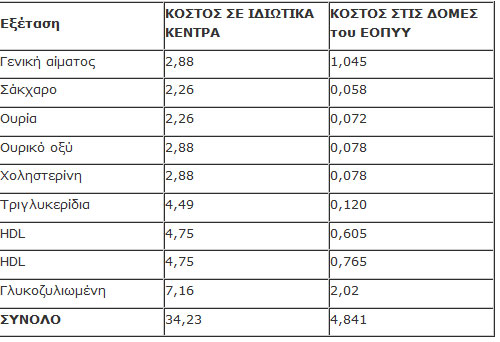 Χωρίς αντιδραστήρια έχουν μείνει όσα εργαστήρια του ΙΚΑ έχουν περάσει υπό τον έλεγχο του ΕΟΠΥΥ.Αποτέλεσμα είναι οι ασφαλισμένοι να αναγκάζονται να καταφεύγουν σε ιδιωτικά εργαστήρια, προκειμένου να κάνουν εξετάσεις, για τις οποίες πληρώνει το Δημόσιο.Όπως σημειώνει η Ομοσπονδία Υγειονομικών Υπαλλήλων του ΕΟΠΥΥ, είναι επιτακτική η ανάγκη άμεσης προμήθειας των κέντρων με τα απαραίτητα υλικά, καθώς «οι εξετάσεις που γίνονται στις δομές του ΕΟΠΥΥ και των Δημόσιων Νοσοκομείων είναι φθηνότερες, γιατί αφορούν παροχή υγειονομικών υπηρεσιών και όχι αγορά η οποία περιλαμβάνει το κέρδος των ιδιωτών»Δείτε τις διαφορές ανάμεσα στις τιμές σε εξετάσεις που γίνονται σε ιδιωτικά κέντρα και εργαστήρια του ΕΟΠΥΥ.