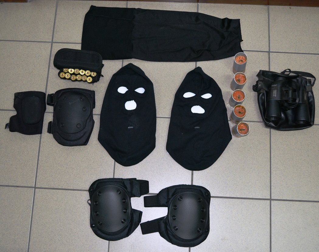 Επίσης, μία σιδερογροθιά και δύο γκλομπ, 89 καπνογόνα-βεγγαλικά, τρεις συσκευές ενδοεπικοινωνίας, ηλεκτρονικοί υπολογιστές και συσκευή αποθήκευσης ψηφιακών δεδομένων, κινητά τηλέφωνα, τρεις κουκούλες τύπου full face, είδη ρουχισμού (φόρμες στρατιωτικού τύπου, γάντια, τζάκετ κ.α.), διάφορα είδη “επιχειρησιακού” εξοπλισμού (θήκες μαχαιριών, ζώνες φυσιγγίων, σακίδια κ.α.), διάφορα έγγραφα και σημειώσεις και δύο οχήματα, ως μέσα τέλεσης αξιόποινων πράξεων.
