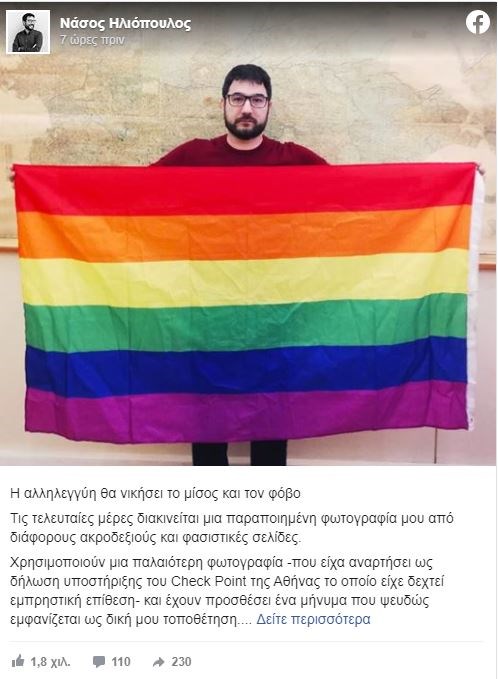 Σ’ όλες τις απαραίτητες νομικές διαδικασίες, ανακοίνωσε ότι θα προβεί ο επικεφαλής της παράταξης «Ανοιχτή Πόλη» στο Δήμο Αθηναίων, Νάσος Ηλιόπουλος, εναντίον όσων διακινούν στο διαδίκτυο παραποιημένη, όπως αναφέρει, μια παλαιότερη φωτογραφία -που είχε αναρτήσει ως δήλωση υποστήριξης του Check Point της Αθήνας όταν είχε δεχτεί εμπρηστική επίθεση.