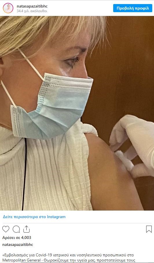 Η Νατάσα Παζαΐτη το πρωί της Πέμπτης, δημοσίευσε μία φωτογραφία στα social media με την ίδια την στιγμή που κάνει το εμβόλιο κατά του κορονοϊού.