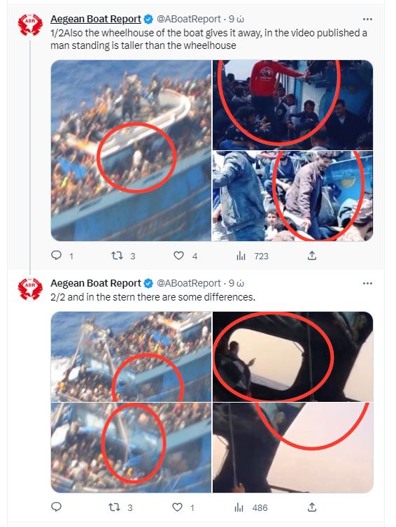 Επίσης λογαριασμοί όπως το Aegean Boat Report δημοσίευσαν καρέ από το σκάφος που βούλιαξε και καρέ από τα δύο αυτά βίντεο που δημοσιεύθηκαν στο TikTok που δείχνουν σημαντικές διαφορές μεταξύ των επιβαινόντων. Ο λογαριασμός SARwatchMED αναφέρει πως πρόκειται σίγουρα για διαφορετικό σκάφος καθώς τα βίντεο έχουν τραβηχτεί νωρίτερα από τις 9 Ιουνίου.
