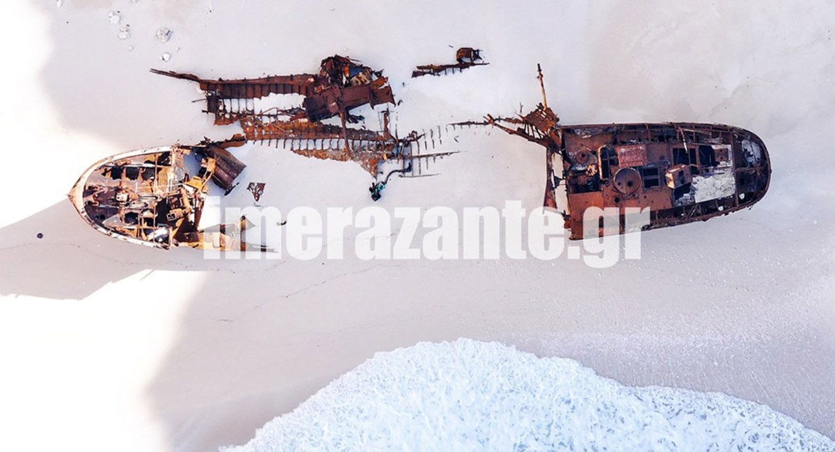 Μάλιστα, όπως αναφέρει το imerazante.gr που ανέδειξε το θέμα, κάποια κομμάτια του πλοίου έχουν πέσει στην παραλία από τη μια πλευρά και όπως φαίνεται στις φωτογραφίες «θάβονται» στην άμμο.