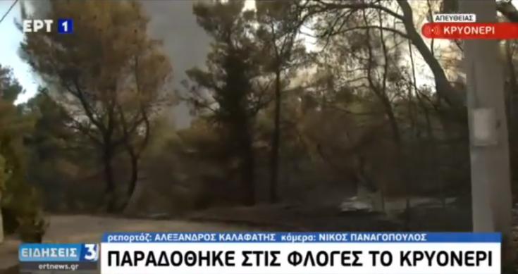 Συγκεκριμένα, κατά τη διάρκεια του οδοιπορικού της ΕΡΤ στην περιοχή, όπου η κάμερα κατέγραψε συγκλονιστικές εικόνες, υπήρξε νέα αναζωπύρωση με τους πυροσβέστες να τρέχουν με υδροφόρες, προκειμένου να ελέγξουν τις φλόγες. Είναι χαρακτηριστικό πως μέσα σε λίγα λεπτά «μαύρισε» ο ουρανός και έγινε αποπνικτική η ατμόσφαιρα με τις φλόγες να καίνε ό,τι έχει απομείνει.
