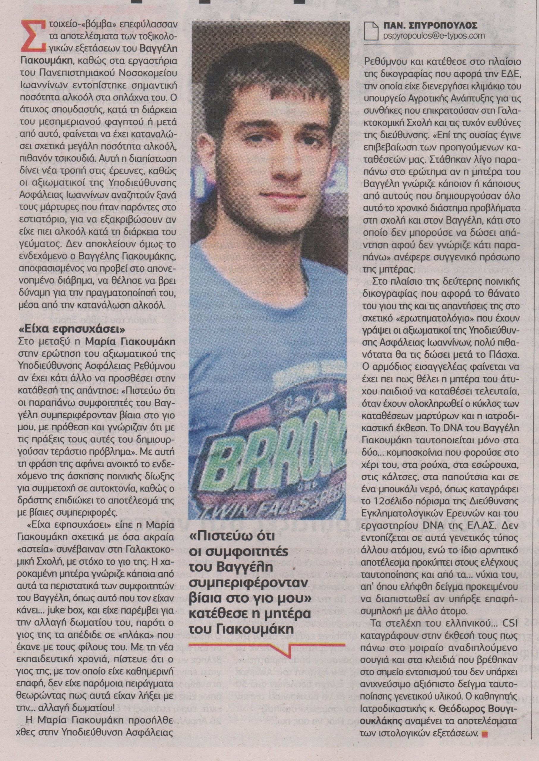 Στοιχείο- “βόμβα” επεφύλασσαν τα αποτελέσματα των τοξικολογικών εξετάσεων του Βαγγέλη Γιακουμάκη, καθώς στα εργαστήρια του Πανεπιστημιακού Νοσοκομείου Ιωαννίνων εντοπίστηκε σημαντική ποσότητα αλκοόλ στα σπλάχνα του.