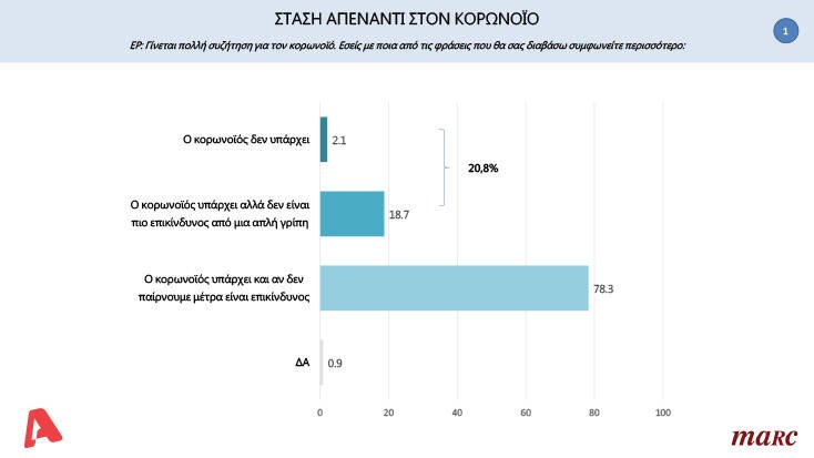 Το 78,3% των Ελλήνων πιστεύει πως ο κορονοϊός υπάρχει και πως αν δεν παρθούν δραστικά μέτρα θα είναι επικίνδυνος για την κοινωνία. Το 20,8% των ερωτηθέντων πιστεύουν πως ο κορονοϊός ή δεν υπάρχει ή υπάρχει αλλά δεν είναι πιο επικίνδυνος από μια απλή γρίπη. Δύο στους δέκα Έλληνες δηλαδή υποτιμάει τον ιό που έχει στοιχίσει τη ζωή σε 490 συνανθρώπους μας.