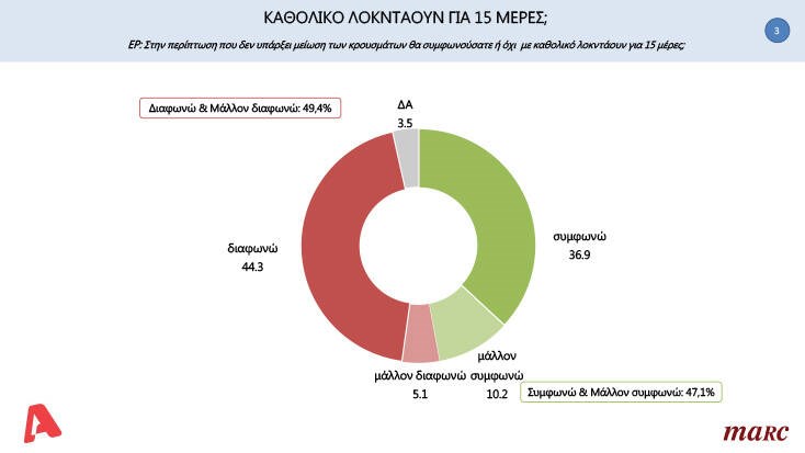 Η επιβολή καθολικού lockdown 15 ημερών προκειμένου να μειωθεί η διασπορά του στη χώρα μας, διχάζει τους Έλληνες. Το 36,9% συμφωνεί με μια τέτοια σκέψη, ενώ το 44,3% διαφωνεί.