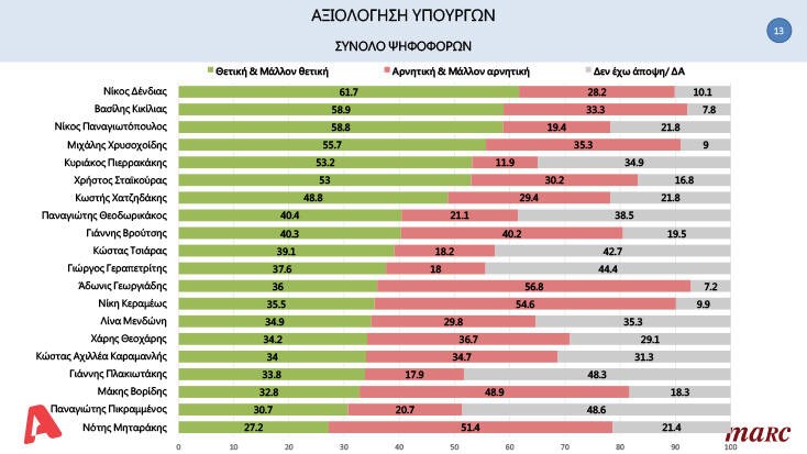 Τη θετική τους ψήφο και στους υπουργούς κλήθηκαν να δώσουν οι ερωτηθέντες. Πιο δημοφιλής αναδείχθηκε ο Νίκος Δένδιας με 61,7% και ακολουθούν στη δεύτερη και τρίτη θέση αντίστοιχα οι Βασίλης Κικίλιας με 58,9% και Νίκος Παναγιωτόπουλος με 58,8