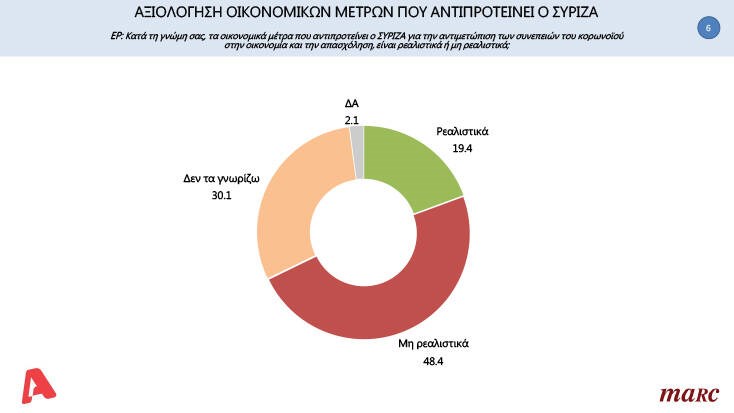 Μάλιστα η πλειοψηφία των πολιτών κρίνει μη ρεαλιστικά τα οικονομικά μέτρα που έχει αντιπροτείνει ο ΣΥΡΙΖΑ. Συγκεκριμένα, το 19,4% τα κρίνει ρεαλιστικά, το 48,4% μη ρεαλιστικά και το 30,1% δεν γνωρίζει καν τα μέτρα.