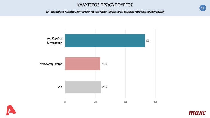 Αναφορικά με το ποιον θεωρούν καταλληλότερο για πρωθυπουργό, σε ποσοστό 53% οι ερωτηθέντες απάντησαν τον Κυριάκο Μητσοτάκη, σε ποσοστό 23,7% απάντησε “κανένας” και το 23,3% απάντησε τον Αλέξη Τσίπρα.