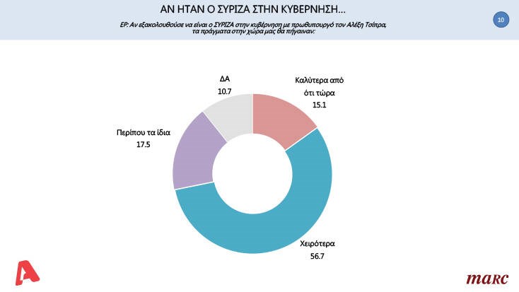 Το 56,7% των ερωτηθέντων πιστεύει πως αν ο ΣΥΡΙΖΑ ήταν κυβέρνηση τα πράγματα θα πήγαιναν χειρότερα. Μόλις το 15,1% απάντησε ότι τα πράγματα θα πήγαιναν καλύτερα από τώρα.