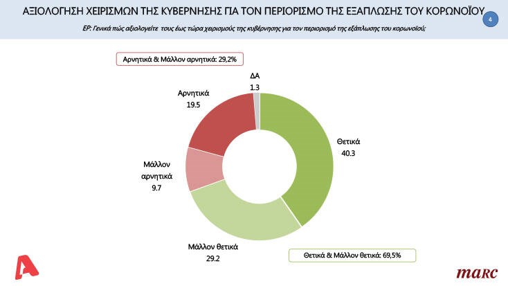 Όσον αφορά την αξιολόγηση της κυβέρνησης για τον περιορισμό της διασποράς του κορονοϊού, το μεγαλύτερο ποσοστό των ερωτηθέντων κρίνουν θετικές τις κινήσεις της. Συγκεκριμένα, το 40,3% απάντησε πως κρίνει θετικά τους χειρισμούς της Κυβέρνησης. Το 19,5 απάντησε αρνητικά, το 29,2% μάλλον θετικά και το 9,7% μάλλον αρνητικά.