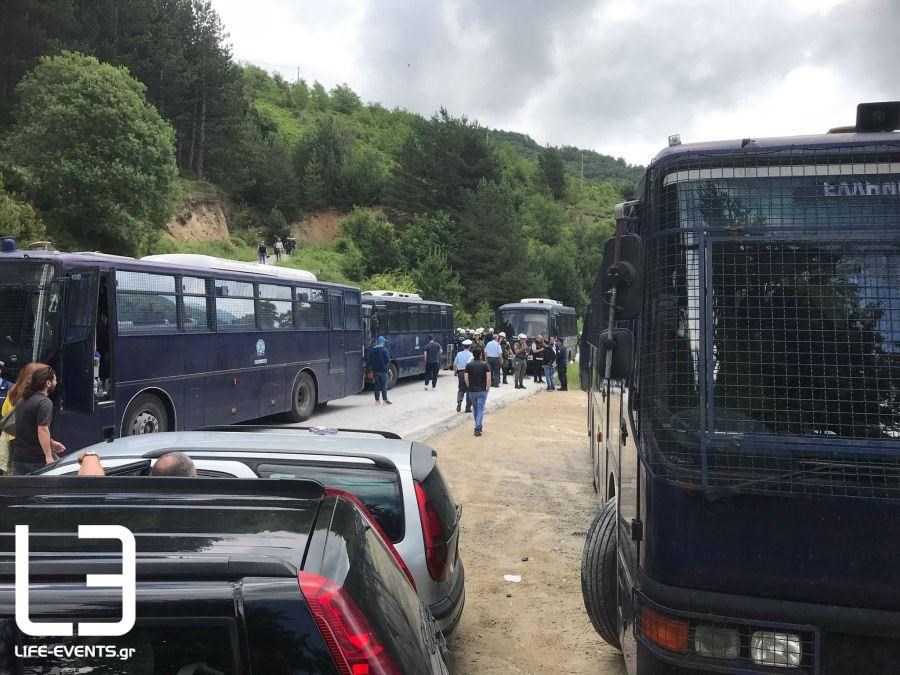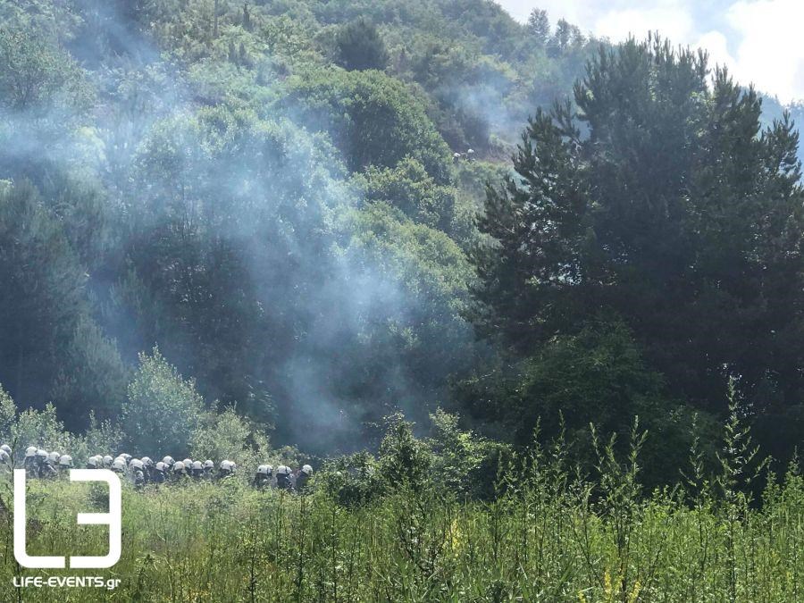 Οι υπουργοί Εξωτερικών Ελλάδας και Σκοπίων υπέγραψαν τη συμφωνία για το ονοματολογικό, αλλά την ίδια στιγμή η ένταση στο σημείο που η Αστυνομία έχει μπλοκάρει το δρόμο, συνεχίζεται με πετροπόλεμο, ρίψη αντικειμένων και χημικών.