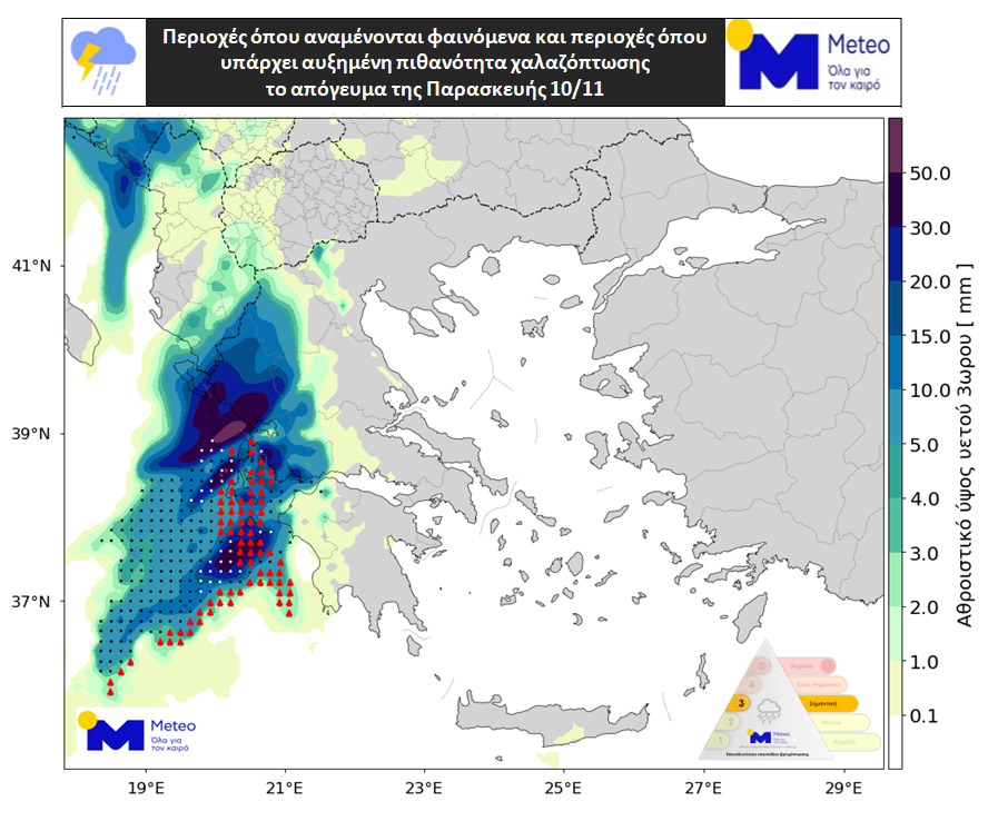 Στους χάρτες που ακολουθούν παρουσιάζεται ο υετός που αναμένεται το απόγευμα και τις πρώτες βραδινές ώρες της Παρασκευής 10/11 καθώς και οι περιοχές με αυξημένη πιθανότητα χαλαζόπτωσης.