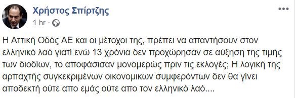 Σε ανάρτηση του στο Facebook, ο κ Σπίρτζης έγραψε: «Η Αττική Οδός ΑΕ και οι μέτοχοί της πρέπει να απαντήσουν στον ελληνικό λαό γιατί ενώ 13 χρόνια δεν προχώρησαν σε αύξηση της τιμής των διοδίων, το αποφάσισαν μονομερώς πριν τις εκλογές; Η λογική της αρπαχτής συγκεκριμένων οικονομικών συμφερόντων δεν θα γίνει αποδεκτή ούτε από εμάς ούτε από τον ελληνικό λαό…».