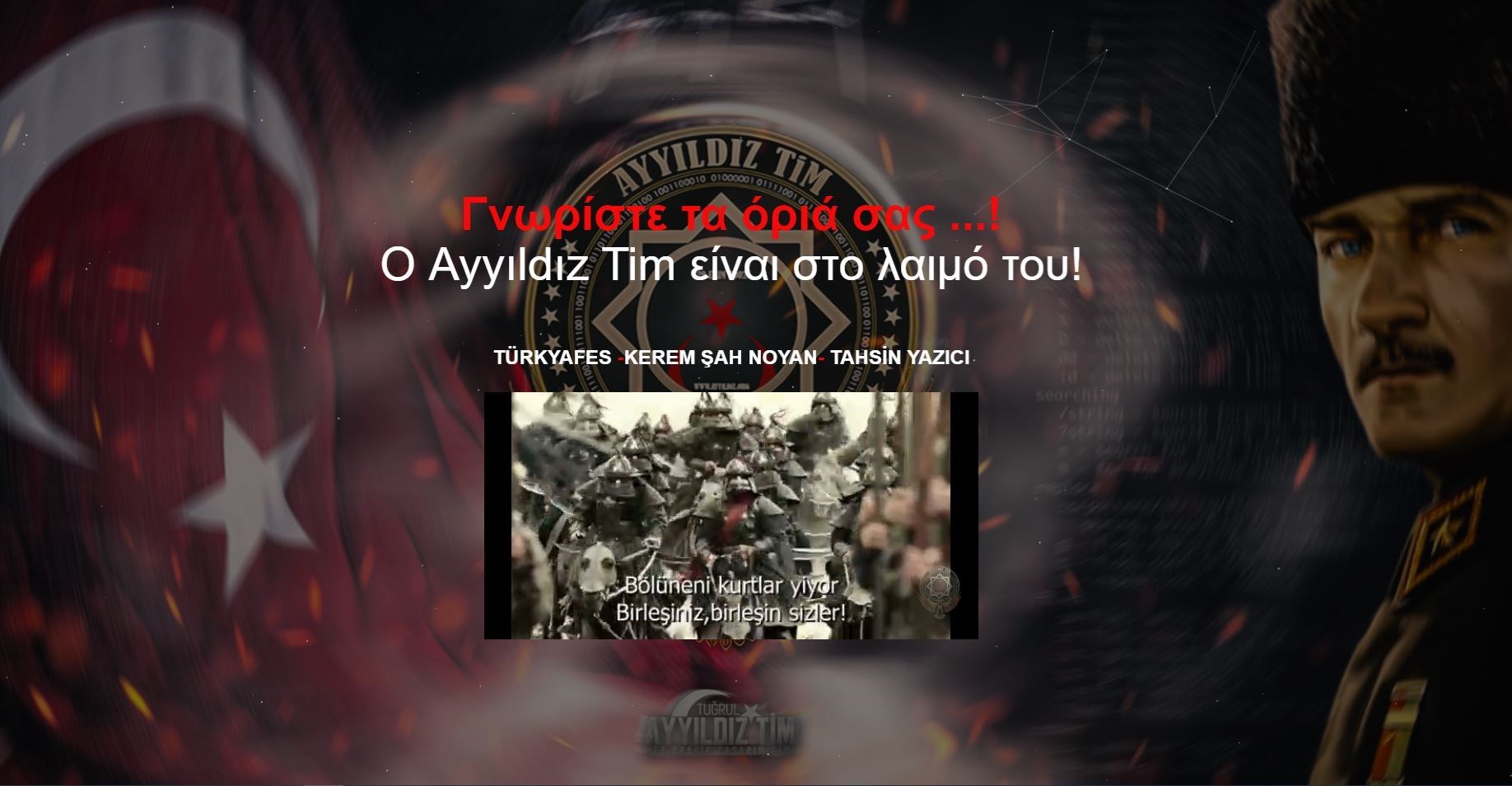 Η ομάδα που αναλαμβάνει, σύμφωνα με το μήνυμα, την ευθύνη της διαδικτυακής επίθεσης είναι: η Ayyidiz Tim που σημαίνει ο “κυβερνοστρατός της Τουρκίας” και απειλεί γράφοντας: “Γνωρίστε τα όρια σας” με… φόντο την τουρκική σημαία και τον Κεμάλ Ατατούρκ και ταυτόχρονα στέλνουν το μήνυμα ότι “η Ayyildiz Tim ήταν εδώ”.