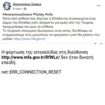 Νωρίτερα σήμερα είχαν “χτυπήσει” και τη σελίδα του τουρκικού υπουργείου Εξωτερικών, σχολιάζοντας πως “Θα θέλαμε να ενημερώσουμε τους μογγολους να ηρεμήσουν γιατί θα χάσουν την μπάλα”, προσθέτουν.