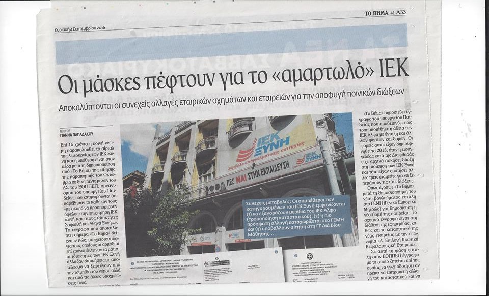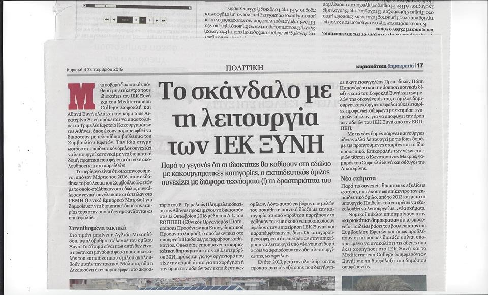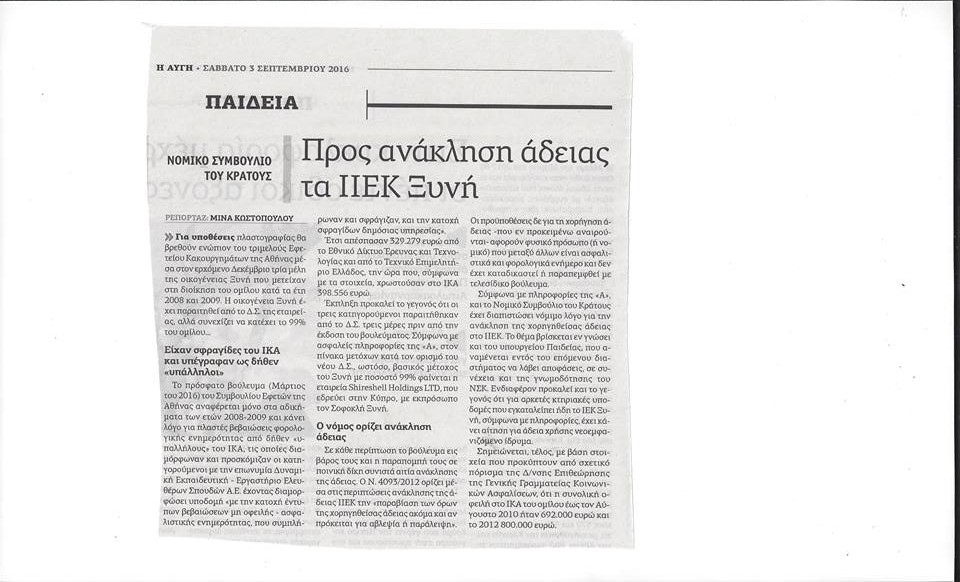 Στο σκάνδαλο με την λειτουργία των ΙΕΚ Ξυνή, αναφέρθηκαν με δημοσιεύματά τους, τρεις εφημερίδες μέσα στο Σαββατοκύριακο. Η Αυγή, η Δημοκρατία και το Βήμα.