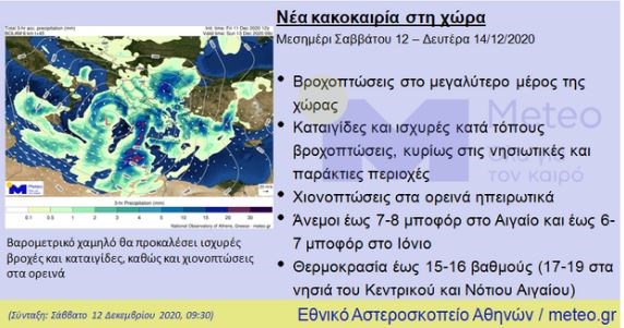 Ένα νέο βαρομετρικό χαμηλό θα επηρεάσει τη χώρα μας από το μεσημέρι, σύμφωνα με τα τελευταία προγνωστικά δεδομένα του Εθνικού Αστεροσκοπείου Αθηνών/meteo.gr. Τα κυριότερα χαρακτηριστικά της επερχόμενης κακοκαιρίας θα είναι οι ισχυρές κατά τόπους βροχοπτώσεις και οι καταιγίδες που θα σημειωθούν κατά κύριο λόγο στις νησιωτικές και παράκτιες περιοχές. Η κακοκαιρία θα διαρκέσει έως και τη Δευτέρα.
