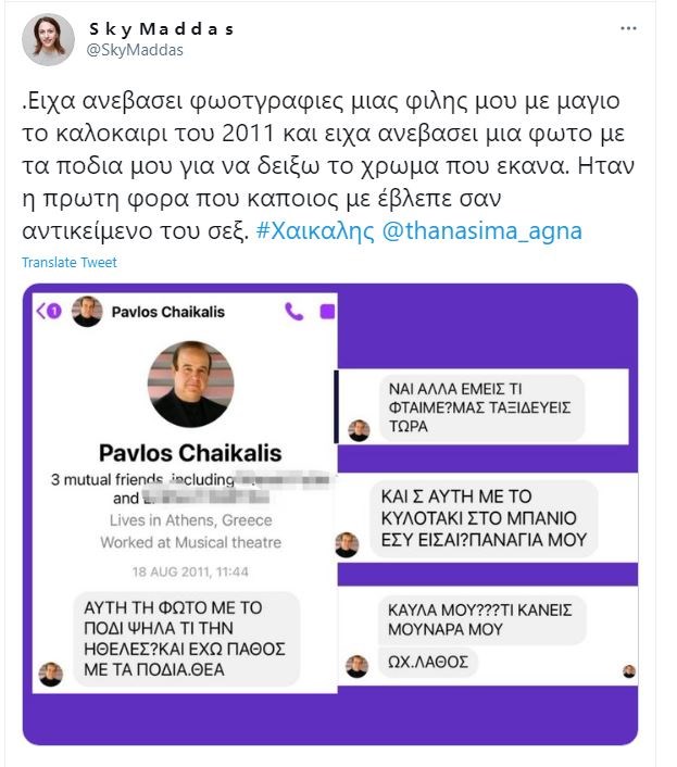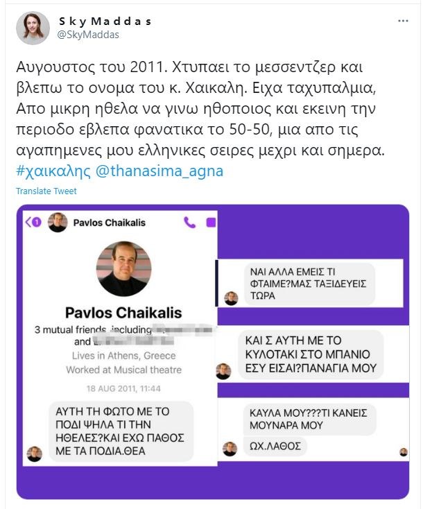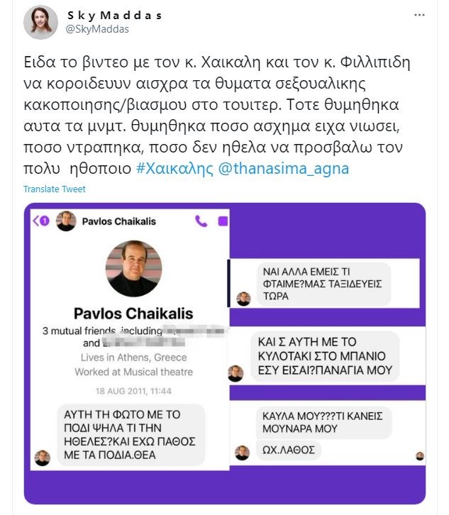 «Είδα το βίντεο με τον κ. Χαϊκάλη και τον κ. Φιλιππίδη να κοροϊδεύουν αισχρά τα θύματα σεξουαλικής κακοποίησης/βιασμού στο twitter. Τότε θυμήθηκα αυτά τα μηνύματα. Θυμήθηκα πόσο άσχημα είχα νιώσει, πόσο ντράπηκα, πόσο δεν ήθελα να προσβάλω τον πολύ ηθοποιό» τόνισε στην τελευταία ανάρτηση σχετικά με τα μηνύματα του Παύλου Χαϊκάλη πριν από περίπου δέκα χρόνια».