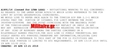 Οι τουρκικές αρχές, όπως αναμενόταν εξέδωσαν την ΝΟΤΑΜ Α1891/16 με την οποία προβάλλουν για μια ακόμη φορά τις αμφισβητήσεις τους για τα όρια του FIR Aθηνών.