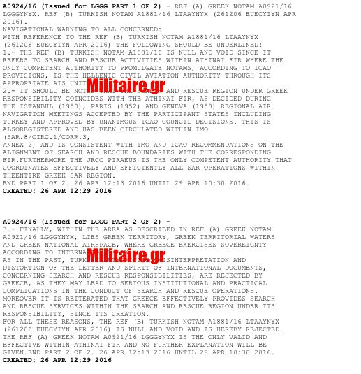 Oι ελληνικές αρχές απάντησαν εκδίδοντας την ΝΟΤΑΜ Α0924/16 με την οποία ακυρώνουν την τουρκική ΝΟΤΑΜ υπενθυμίζοντας ότι τα όρια του ελληνικού τομέα SAR συμπίπτουν με τα όρια του FIR σύμφωνα με τους κανονισμούς των διεθνών οργανισμών.