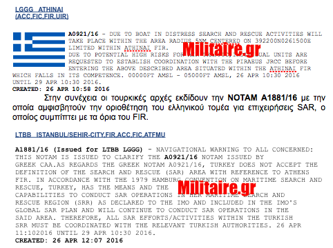 Ειδικότερα, οι ελληνικές αρχές εξέδωσαν την ΝΟΤΑΜ Α0921/16 με την οποία ανακοίνωσαν την διεξαγωγή της επιχείρησης SAR και καθορίζουν τα όρια της περιοχής της, σύμφωνα με τους κανονισμούς ασφαλείας.