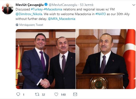 Από τον επίσημο λογαριασμό του Τούρκου υπουργού άλλωστε, αναφορικά με την συνάντηση, έγινε η εξής δήλωση: «Συζητήσαμε τις σχέσεις Τουρκίας – Μακεδονίας και περιφερειακά ζητήματα με τον υπουργό Ντιμιτρόφ. Ευχόμαστε να καλωσορίσουμε την Μακεδονία στο ΝΑΤΟ ως τον 30ό μας σύμμαχο, χωρίς άλλη καθυστέρηση».