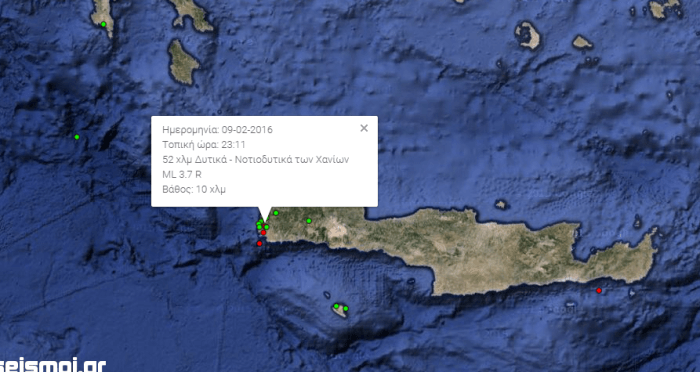 Συγκεκριμένα, καταγράφηκε στις 23.11 το βράδυ της Τρίτης 9 Φεβρουαρίου, αυτή τη φορά 52 χιλιόμετρα δυτικά – νοτιοδυτικά των Χανίων Κρήτης.