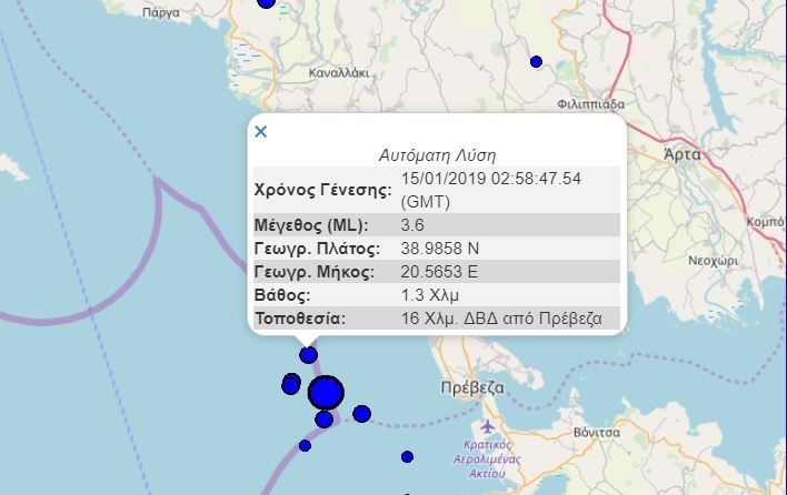 Νέα σεισμική δόνηση σημειώθηκε πριν από λίγο στην Πρέβεζα.Σύμφωνα με την αυτόματη, προκαταρκτική λύση του Γεωδυναμικού Ινστιτούτου του Αστεροσκοπείου Αθηνών, ήταν μεγέθους 3,6 βαθμών της κλίμακας Ρίχτερ σε εστιακό βάθος 1,3 χιλιομέτρων.Όσο για το επίκεντρο, εντοπίζεται στα 16 χιλιόμετρα δυτικά-βορειοδυτικά της Πρέβεζας.Δείτε τη φωτογραφία: