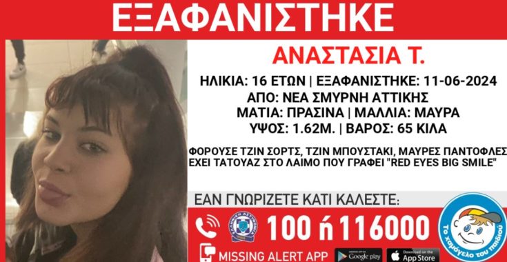 Η 16χρονη Αναστασία Τ. εξαφανίστηκε στις 11/06/2024, μεσημεριανές ώρες, από χώρο παιδικής προστασίας στην περιοχή της Νέας Σμύρνης Αττικής. «Το Χαμόγελο του Παιδιού» ενημερώθηκε σήμερα 13/6/2024 και προχώρησε στη δημοσιοποίηση των στοιχείων της ανήλικης κατόπιν εισαγγελικής εντολής, καθώς συντρέχουν λόγοι που θέτουν τη ζωή της σε κίνδυνο.