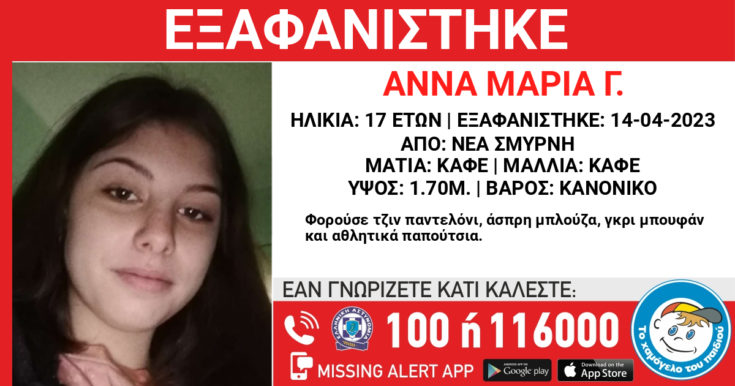 Τα ίχνη της Άννας Μαρίας Γ. χάθηκαν στις 14/04/2023 από τη Μονάδα Κοινωνικής Φροντίδας Παιδόπολη «Αγία Βαρβάρα». Το «Χαμόγελο του Παιδιού» ενημερώθηκε σήμερα, 20/04/2023, από τις Αρμόδιες Αστυνομικές Αρχές και προχώρησε στη δημοσιοποίηση των στοιχείων της ανήλικης, κατόπιν εισαγγελικής εντολής, καθώς συντρέχουν λόγοι που θέτουν τη ζωή της σε κίνδυνο.