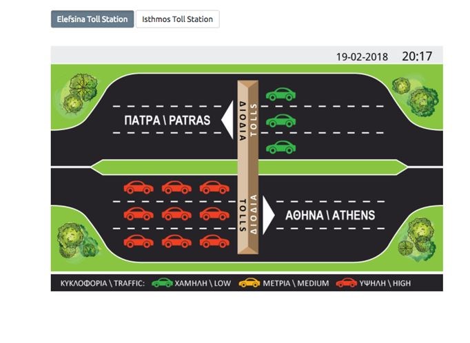 - Να βλέπουν την τρέχουσα κυκλοφορία σε δύο σταθερά σημεία του αυτοκινητόδρομου, στα διόδια της Ελευσίνας και τα διόδια του Ισθμού κατά την αναγραφόμενη μέρα και ώρα. Συγκεκριμένα, στην εφαρμογή αποτυπώνεται η πυκνότητα της κυκλοφορίας των προηγούμενων τελευταίων 15’ της ώρας. Η αποτύπωση είναι γραφιστική, αφορά και τα δύο ρεύματα κυκλοφορίας (προς Πάτρα και προς Αθήνα) και σημαίνεται με διαφορετικούς χρωματισμούς ανάλογα με την έντασή της (χαμηλή, μέτρια, υψηλή).