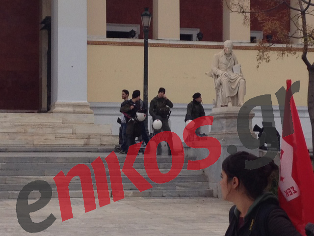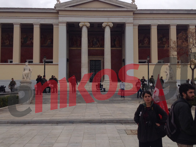 Μία διμοιρία των ΜΑΤ βρίσκεται μπροστά από το κεντρικό κτίριο του Πανεπιστημίου, ενώ αστυνομικές δυνάμεις υπάρχουν και στους γύρω δρόμους.