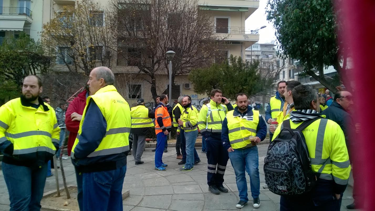 Οι εργαζόμενοι στα Μεταλλεία Κασσάνδρας και κάτοικοι της Χαλκιδικής, που έφτασαν στη Θεσσαλονίκη για να συμμετάσχουν στο συλλαλητήριο της ΓΣΕΕ, συγκεντρώνονται στον Άγιο Δημήτριο.