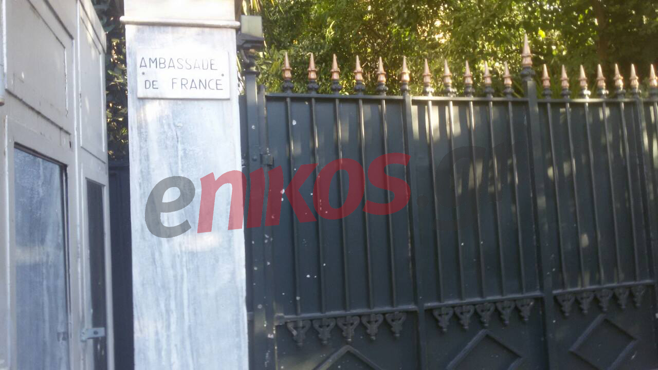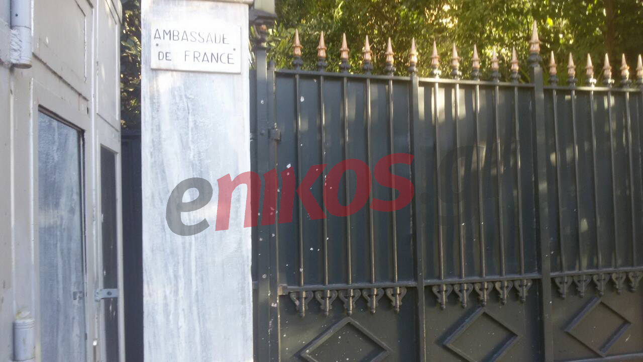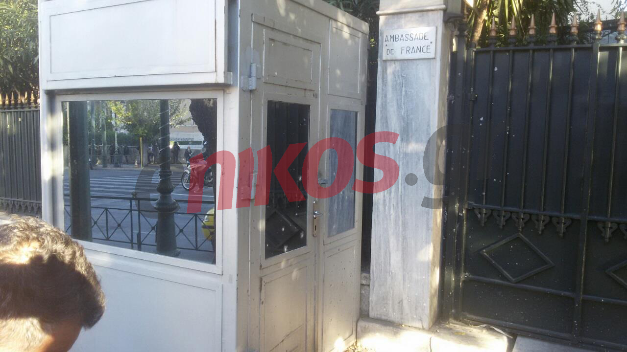 Εμφανή είναι τα σημάδια από τα θραύσματα της χειροβομβίδας στην είσοδο της γαλλικής πρεσβείας, μετά την επίθεση που σημειώθηκε τα ξημερώματα από δύο αγνώστους που επέβαιναν σε μοτοσυκλέτα.