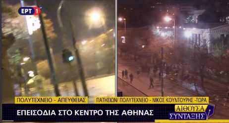 Αποπνικτική η ατμόσφαιρα στην Πατησίων μπροστά στο Πολυτεχνείο με τους αντεξουσιαστές να πετούν πέτρες και βόμβες μολότοφ και τις δυνάμεις των ΜΑΤ να απαντούν με δακρυγόνα και χημικά.