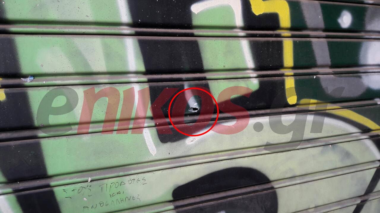 Όπως φαίνεται στις φωτογραφίες του enikos.gr, οι αδέσποτες σφαίρες των δραστών σταμάτησαν στον τοίχο και την είσοδο των καταστημάτων.