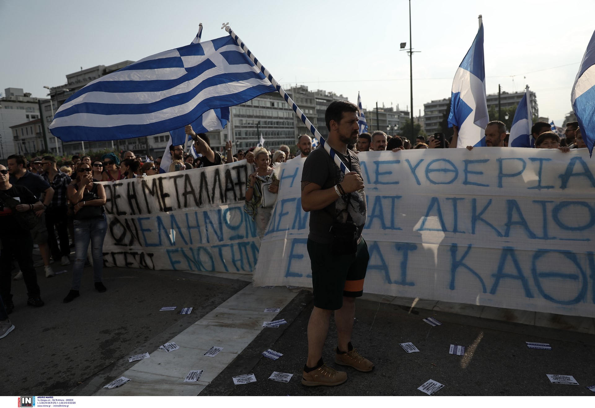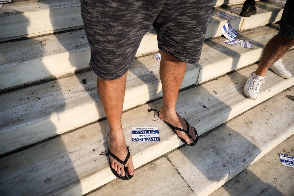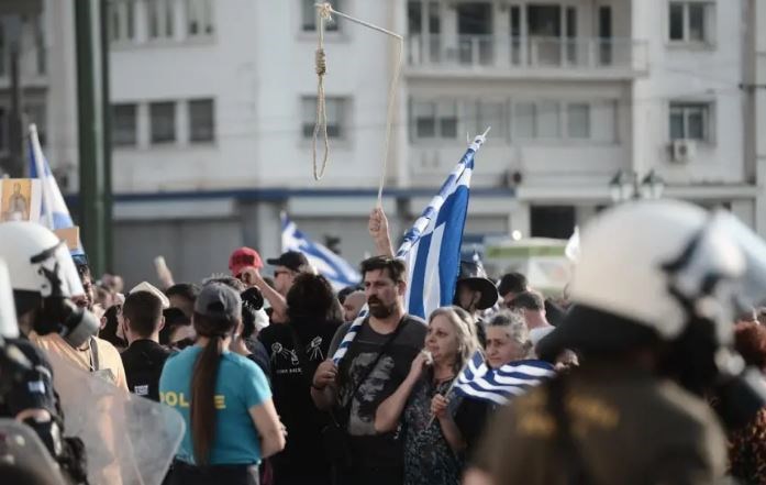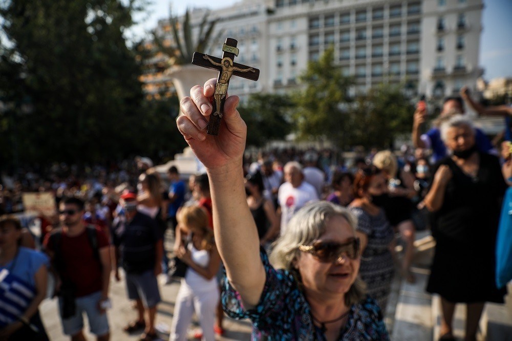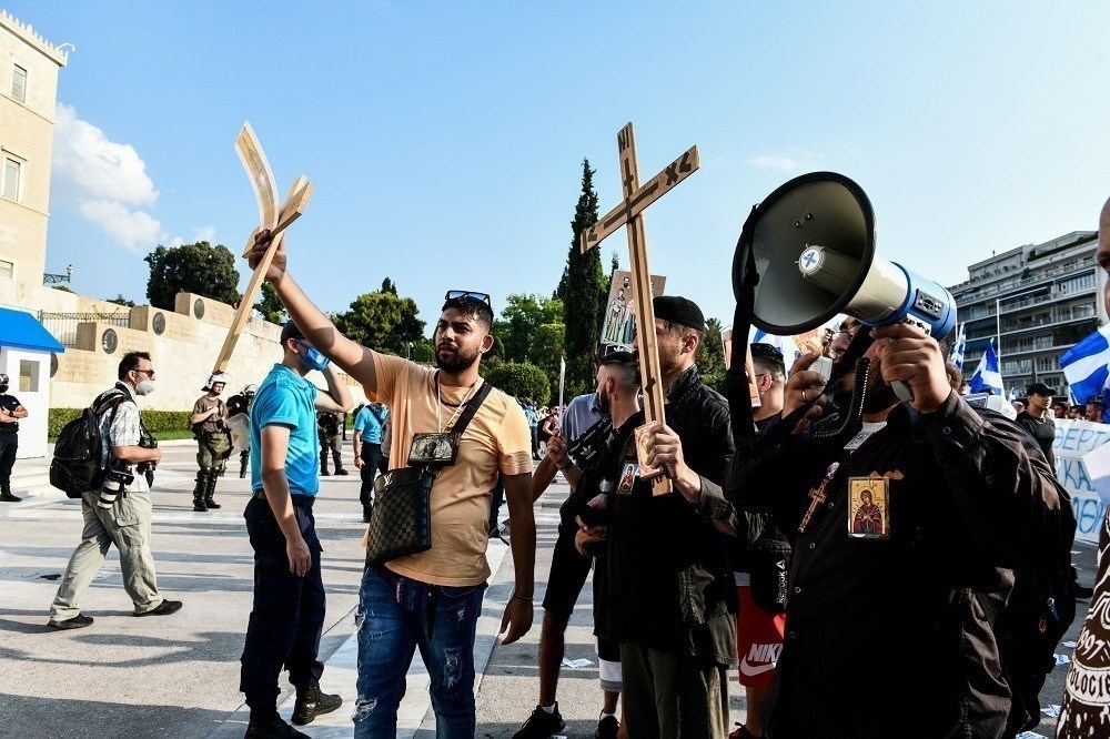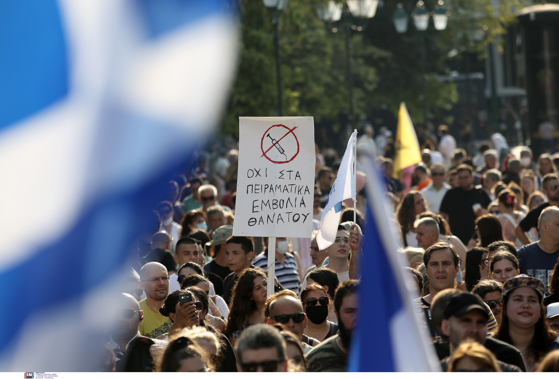 Η διαμαρτυρία στην Αθήνα έγινε μπροστά στο μνημείο του Άγνωστου Στρατιώτη με τους συγκεντρωμένους να κρατούν ελληνικές σημαίες, σταυρούς, αλλά και μία κρεμάλα. Ορισμένοι κρατούσαν πανό και πλακάτ με συνθήματα: “Όχι στον υποχρεωτικό εμβολιασμό”, “Όχι στα πειραματικά εμβόλια θανάτου”. Στο έδαφος υπήρχαν διασκορπισμένα φυλλάδια του κόμματος του καταδικασμένου για διεύθυνση εγκληματικής οργάνωσης, Ηλία Κασιδιάρη.
