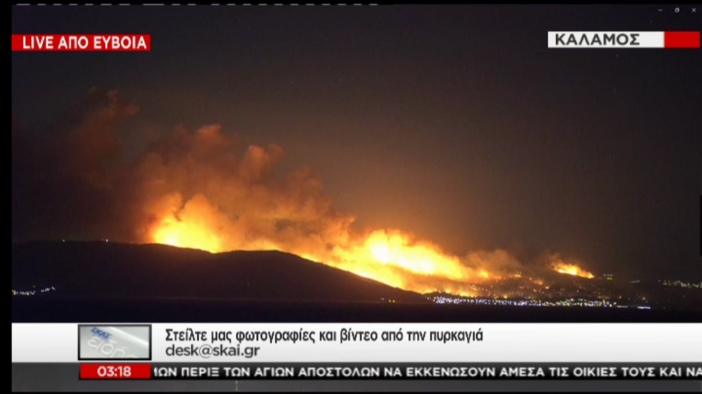 Νέες σοκαριστικές εικόνες από το πώς φαίνεται το πύρινο μέτωπο του Καλάμου από την Εύβοια μετέδωσε πριν από λίγο ο ΣΚΑΪ.
