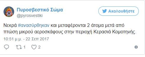 Νωρίτερα, ο πύραρχος Λεωνίδας Καραγκούνης, προϊστάμενος του περιφερειακού επιχειρησιακού κέντρου πυροσβεστικών υπηρεσιών Ανατολικής Μακεδονίας και Θράκης, δήλωσε στο Αθηναϊκό-Μακεδονικό Πρακτορείο ότι το σημείο στο οποίο εντοπίστηκε το μονοκινητήριο αεροσκάφος ήταν ιδιαίτερα απόκρημνο. Δείτε το tweet της Πυροσβεστικής: