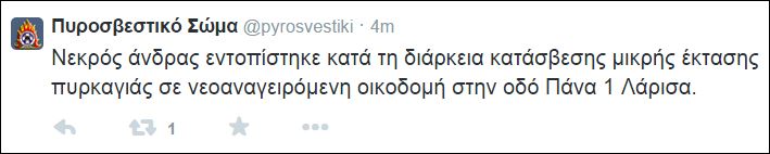 Ένας άνδρας εντοπίστηκε νεκρός από την πυροσβεστική κατά τη διάρκεια κατάσβεσης πυρκαγιάς , τη Λάρισα.