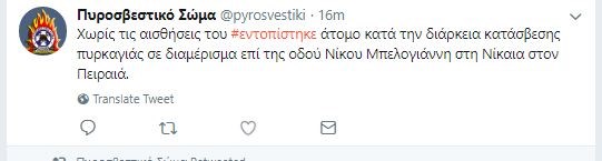 Φωτιά ξέσπασε σε διαμέρισμα επί της οδού Νίκου Μπελογιάννη στη Νίκαια. Στο σημείο έσπευσαν δυνάμεις της Πυροσβεστικής. Κατά τη διάρκεια της κατάσβεσης ανασύρθηκε ένα άτομο χωρίς τις αισθήσεις του.