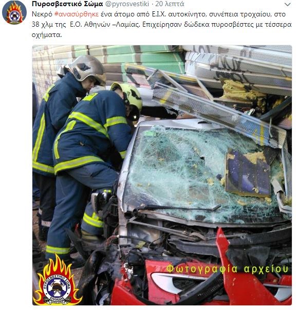 Ένας άνδρας έχασε τη ζωή του στο τροχαίο που σημειώθηκε στις 9 και 20 το πρωί, στο 38χλμ. της Εθνικής οδού Αθηνών- Λαμίας, στο ύψος της Μαλακάσας.