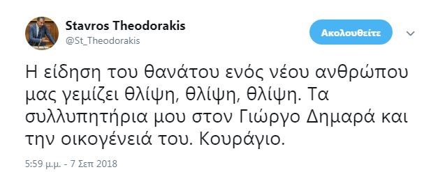 «Η είδηση του θανάτου ενός νέου ανθρώπου μας γεμίζει θλίψη, θλίψη, θλίψη. Τα συλλυπητήρια μου στον Γιώργο Δημαρά και την οικογένειά του. Κουράγιο» έγραψε στο Twitter ο Επικεφαλής του Ποταμιού Σταύρος Θεοδωράκης.