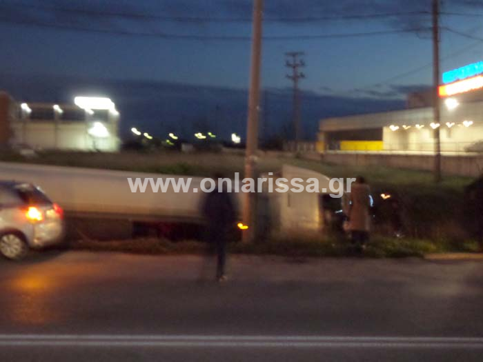 Το βυτιοφόρο που κινούνταν με κατεύθυνση από την παλαιά εθνική οδό προς την περιφερειακή της Τρικάλων, δε σταμάτησε στο φανάρι, πέρασε πάνω από τη νησίδα και έπεσε σε χαντάκι.